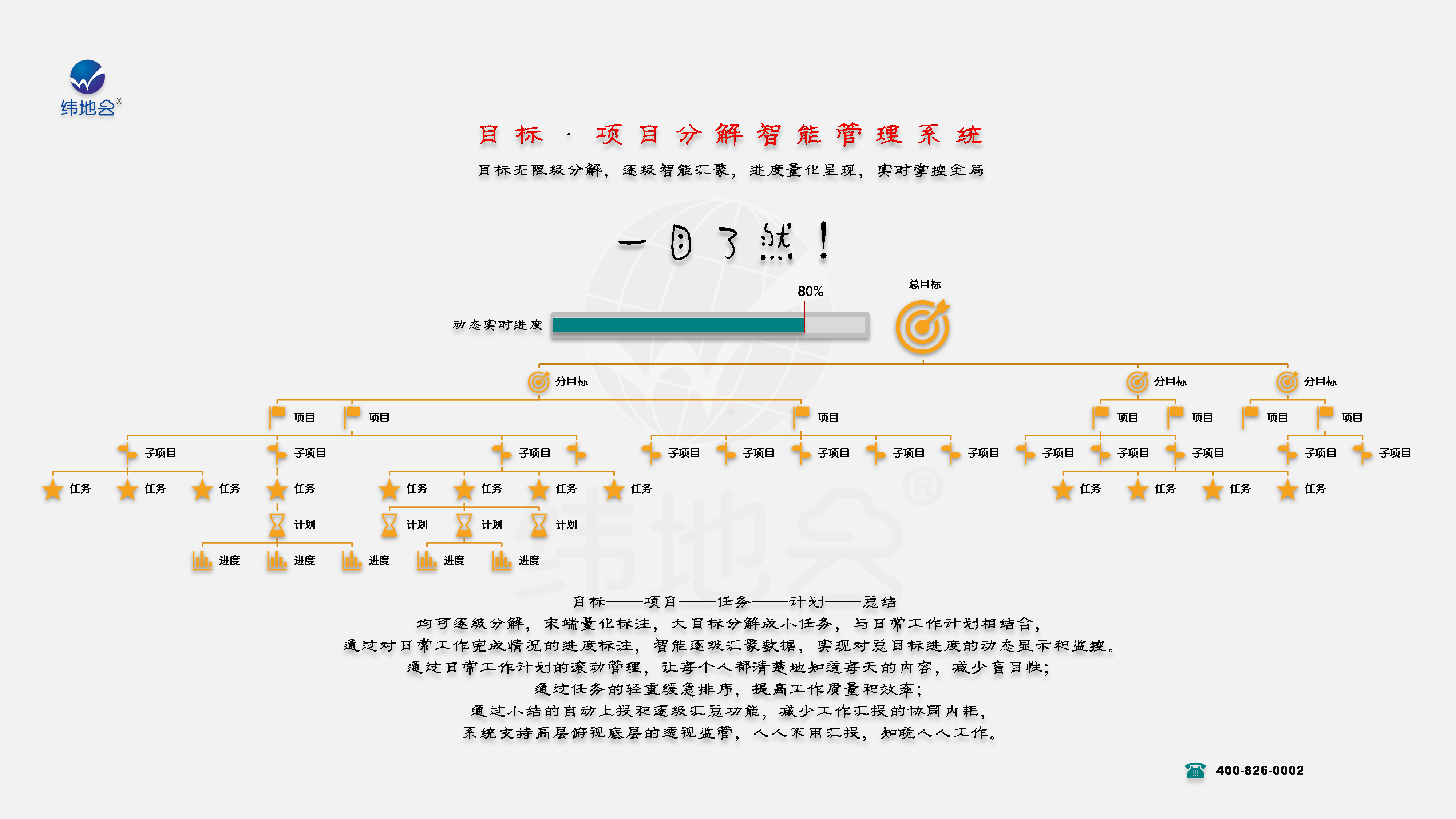 新的一年开始了,您一定有了更好的目标和规划! 对目标的分解、落实情况及进度监控将成为您新的一年里重要的工作内容,为了帮助您实时掌控全局,我们“纬地云”特研发“目标分解与进度智能动态监控系统”,想必会助力您的伟业成功,敬请体验……